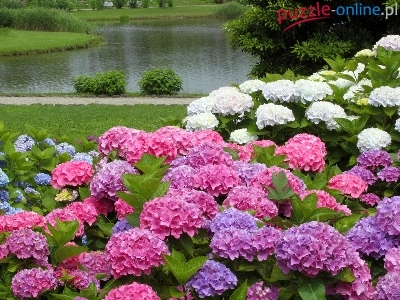 Puzzle Kolorowe, Park, Staw, Hortensje