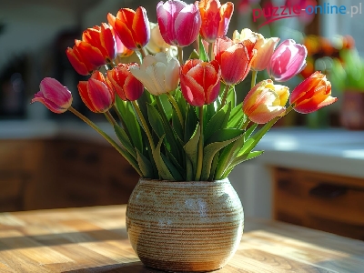 Kwiaty, Kolorowe, Tulipany, Stół, Wazon