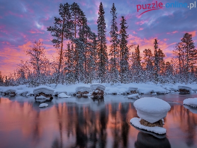 Rosja, Zima, Półwysep Kolski, Drzewa, Jezioro