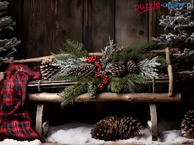 Jagody, Ławka, Choinki, Kompozycja, Szyszki, Koc, Śnieg