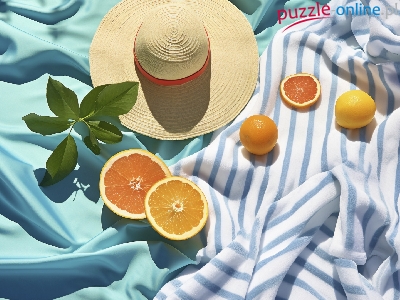 Zielone, Materiał, Listki, Kompozycja, Owoce, Niebiesko-biały, Gałązka, Pomarańcze, Niebieski, Kapelusz, Grafika AI