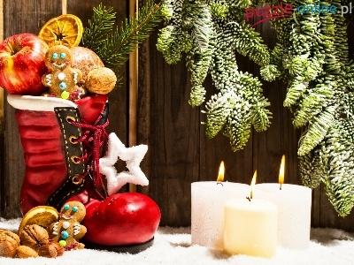 Świece, Świąteczna, Ciastka, Gałązki, Gwiazdki, But, Owoce, Kompozycja