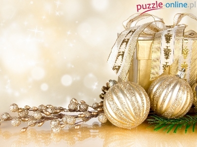 Złote, Kompozycja, Boże Narodzenie, Gałązki, Prezent, Bombki, Świąteczna