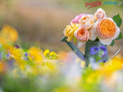 Kwiaty, Konewka, Róże, Tło, Rozmyte