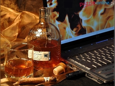 Koniak, Laptop, Szklaneczka, Butelka, Cygaro