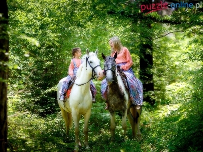 Puzzle Konie, Kobieta, Dziewczynka, Las