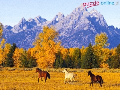Puzzle Konie, Góry, Las, Łąka