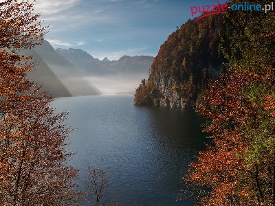 Bawaria, Niemcy, Mgła, Góry, Jezioro, Drzewa, Jesień, Konigssee