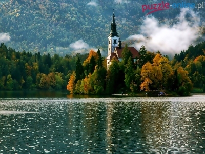 Bled, Kościół, Słowenia, Mgła, Jezioro, Las, Jesień