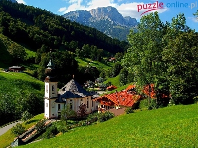 Puzzle Łąka, Góry, Kościół, Drzewa