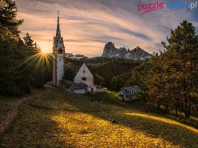 Kościół, Góry, Wzgórza, Drzewa, Promienie słońca