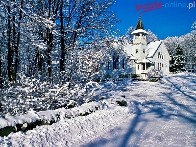 Drzewa, Kościół, Cień, Droga, Zima, W Śniegu, Światło