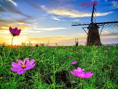 Kosmea, Łąka, Słońca, Wiatrak, Kwiaty, Zachód
