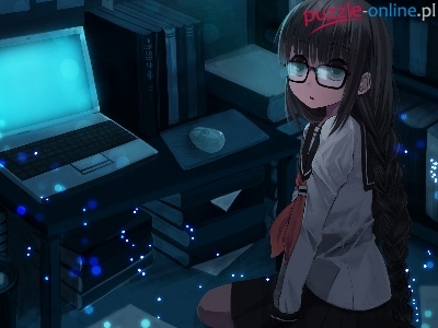 Książki, Pokój, Manga, Okulary, Anime, Laptop, Myszka, Dziewczyna, Biurko, Kosz
