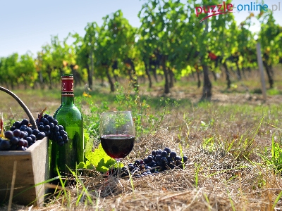 Kieliszek, Koszyk, Sad, Winogrono, Wino, Butelka, Trawa