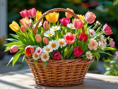 Bukiet, Stokrotki, Różowe, Koszyk, Żółte, Tulipany, Wiklinowy