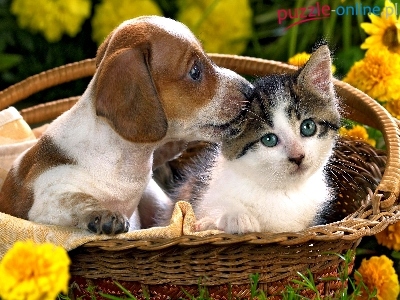 Puzzle Koszyk, Kot, Szczeniaczek, Kwiaty