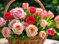 Tulipany, Kwiaty, Róże, Koszyk
