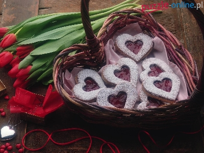 Koszyk, Tulipanów, Serduszka, Bukiet, Wiklinowy, Ciastka