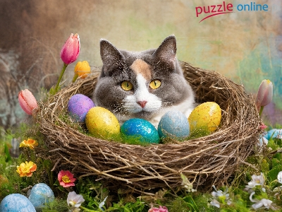 Wielkanoc, Kot, Gniazdko, Trawa, Pisanki