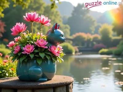 Doniczka, Kot, Kwiaty, Grafika, Jezioro