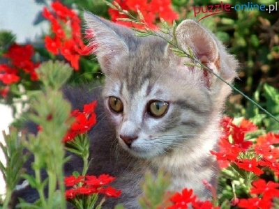 Puzzle Czerwone, Kotek, Kwiatki