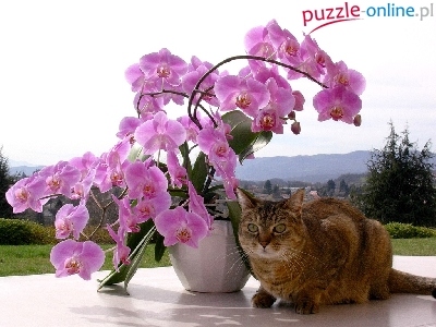 Puzzle Kotek, Storczyk, Doniczka, Krajobraz