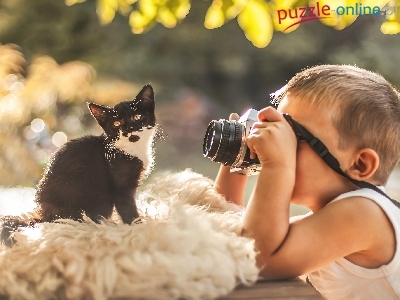 Kotek, Chłopiec, Fotograficzny, Dziecko, Kot, Aparat