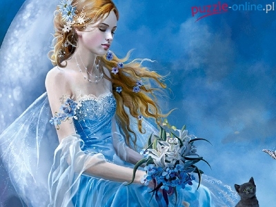 Puzzle Kotek, Dziewczyna, Księżyc, Kwiaty