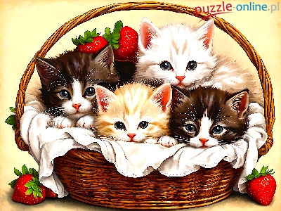 Truskawki, Cztery, Małe, Kotki, Grafika, Koszyk