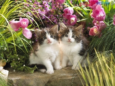 Kotki, Dwa, Słodkie, Kwiaty