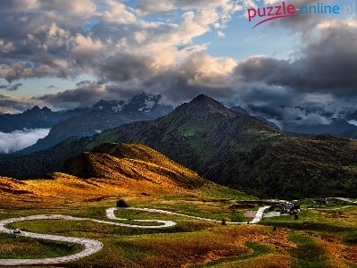 Kręta, Mgła, Domy, Góry, Chmury, Droga