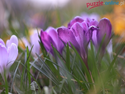 Jasnofioletowe, Krokusy, Ciemnofioletowe, Trawa, Kwiaty