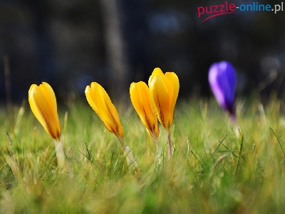 Puzzle Krokusy, Wiosna, Kwiaty, Trawa