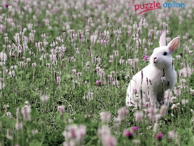 Łąka, Kwiaty, Biały, Królik, Fioletowe
