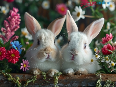 Dwa, Króliki, Białe, Kwiaty, Kłoda
