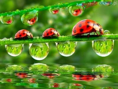 Krople, Odbicie, Biedronki, Trawa, Wody
