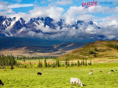 Krowy, Chmury, Góry, Drzewa, Pastwisko