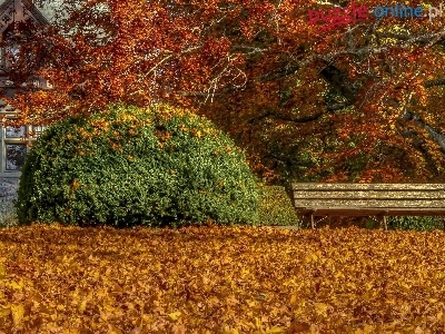 Krzew, Dom, Liście, Jesień, Drzewa, Ławka