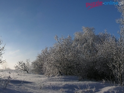 Puzzle Śnieg, Drzea, Krzewy, Niebo