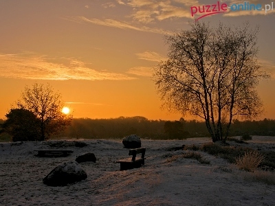 Krzewy, Słońca, Śnieg, Zachód, Drzewa, Ławeczka