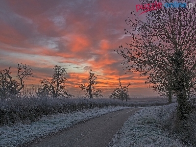 Krzewy, Zachód Słońca, Droga, Drzewa, Szron