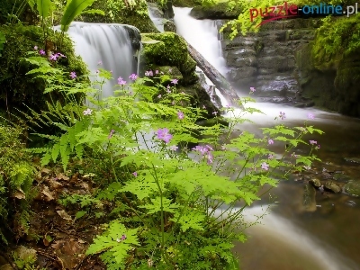 Krzewy, Rzeka, Wodospad, Kamienie, Kwiaty