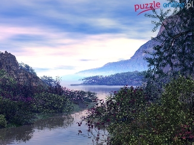 Puzzle Krzewy, Rzeka, Kwitnące, Góry