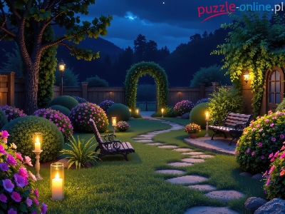 Świece, Noc, Ogród, Krzewy, Ścieżka, Ławki