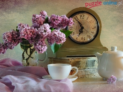 Bukiet, Książki, Czajniczek, Zegar, Kompozycja, Bez, Filiżanka