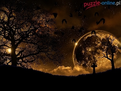 Księżyc, Nietoperze, Noc, Cmentarz, Drzewa