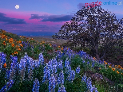Puzzle Drzewo, Łubin, Kwiaty, Księżyc