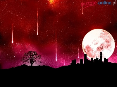 Księżyc, Drzewo, Gwiazdy, Noc, Miasto, Spadające