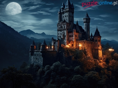 Zamek, Księżyc, Noc, Grafika, Góry